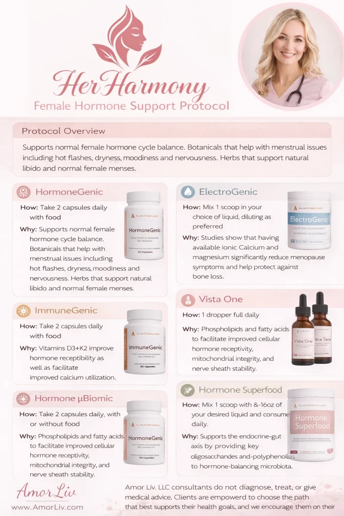 Her Harmony by Amor Liv is a women’s wellness program designed to support the unique rhythms, hormones, and healing needs of the female body. Grounded in holistic medicine and personalized care, this program helps women rebalance energy, regulate cycles, improve mood, and restore vitality-naturally. Whether you’re navigating PMS, perimenopause, adrenal fatigue, or simply seeking to feel more in tune with your body, Her Harmony meets you where you are and guides you toward where you want to be.